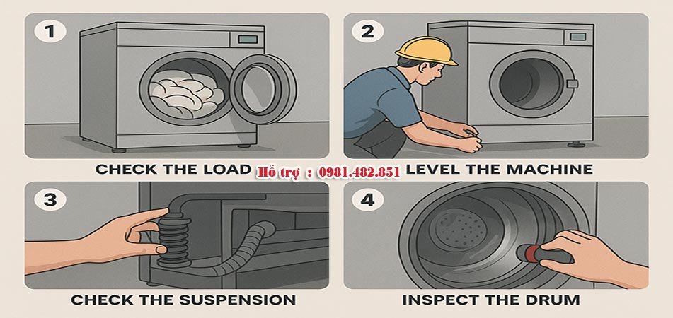 Lưu ý: Máy giặt công nghiệp rất nhạy với mất cân bằng tải, đặc biệt ở tốc độ vắt cao (600–1000 vòng/phút).